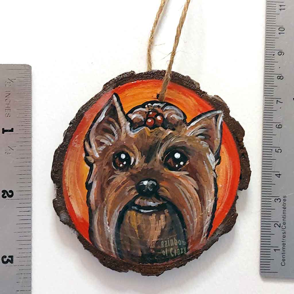 a round wood ornament, hand painted with a portrait of a Yorkshire Terrier's smiling face, against a background of red and oranges, back signed with Rainbow of Crazy